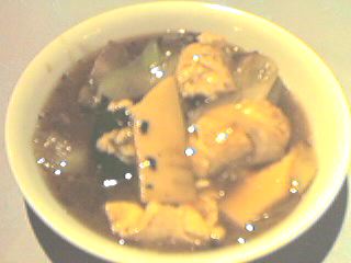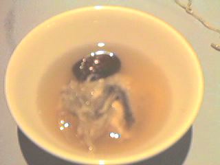 - ただの竹筒入りスープは600円だったが、どうせならフカヒレスープのほうが飲んでみたかったので3人で1個だけ頼んでみた。竹筒というから、竹をそのまま斜めに切ったような細い筒が出てくるのかと思ったら、写真のようなちゃんとした容器だった。スープには確かに竹の香りが移っていて、ちょっと面白いスープだった。普通の(フカヒレ入りでない)竹筒スープを頼んでも十分楽しめるだろう。