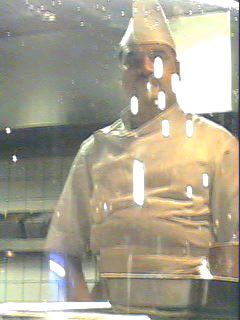 お店の入口にも、あの人が立っていました。ここでもやはり明るいショーウィンドウの横に立っているという状況なので、あまり綺麗には撮れていません。