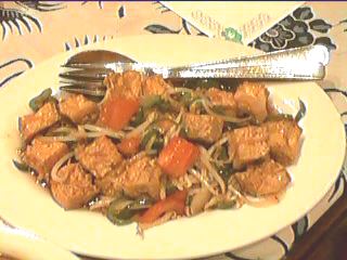 - 揚げ豆腐をモヤシ、ピーマン、トマトなどと炒めたもの。