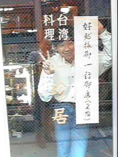 今回は予約して行ったので、お店の入口に「好越様御一行様御席(2階)」という貼り紙がありました。貼り紙の向こう側には、例によってあの人が!(笑)