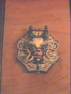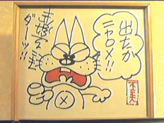 今まではいつも1階席でしたが、今回は予約してあったためか、2階の個室に通されました。通された個室の入口の壁になんだかよく分からない飾りがあったり、2階の廊下に赤塚不二夫のサインが飾られていたりします。