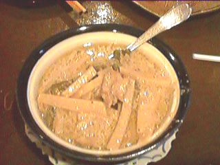 - ココナッツミルクの甘いどろっとしたタレ。凄く甘くてココナッツミルク!って感じだね。インドネシア料理のサテと同じだね。付け合わせのピクルスみたいなのもよかったね。(messiah)
