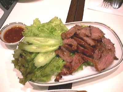 - 豚の頬肉らしいんだけど、歯ごたえもいいしね。そのまま食べると、確かに普通の焼肉という感じもするけど、タレにつけて食べると、ナンプラーの香りといい、タイ料理っていう感じになるよ。(messiah)
