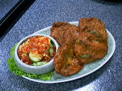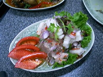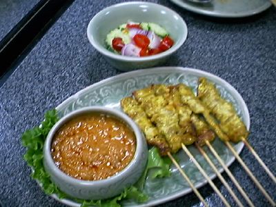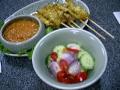 - 豚肉の串焼き。タレはココナツの甘辛ソース。つけあわせはきゅうり、赤い小さい玉ねぎ(ホムデン)、あと唐辛子酢漬け。このつけあわせは繰り返しでてきた。(messiah)