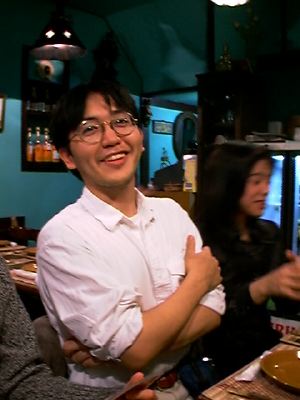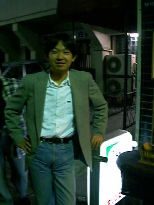 JKさん。この寒いのにTシャツだけど、辛い料理に備えて上着脱いでただけだった。