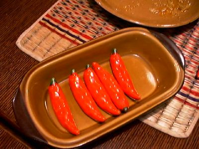 唐辛子の箸置き。後ろの棚に置いてあったよ。