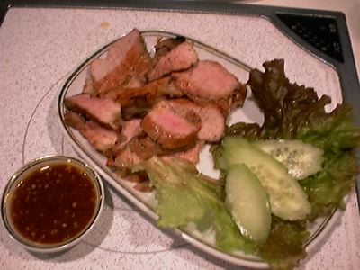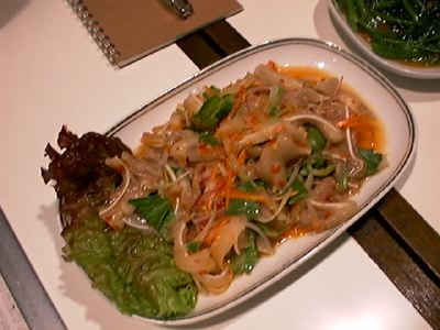 - 色々なお店のメニューにもあったんだけど、二回目のキンナリーで初めて頼んでみた。味付けが独特だね。脂身とか生姜とかニンニクのスライス。それから、魚の目みたいに見える粒胡椒がたくさん入ってる。粒胡椒をかじった時に口の中に広がる風味がいいね。(messiah)