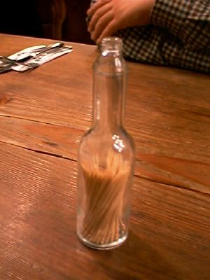テーブルに置いてある楊枝立てはタバスコの空き瓶。
