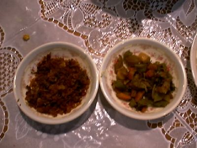 - 鰹フレークの唐辛子あえと、野菜の漬け物みたいなやつ。(messiah)