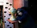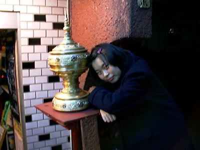 お店の入口に飾ってある壺と記念撮影するyukoちゃん。