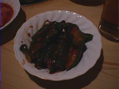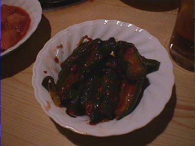 - ここのオイキムチは唐辛子で赤く漬けてある。よそではたいてい透明なんだけど。にらとか入ってる。