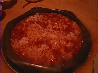 - モツ鍋の後は、ご飯を入れてもらっておじやです。