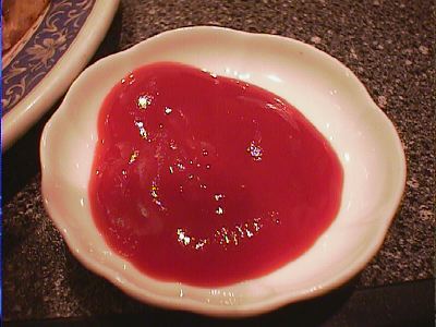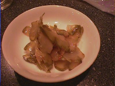 - 酢漬けの唐辛子です。美味しいけど、料理にかけてはみなかった。(食べ終わってから存在に気づいた)(め)