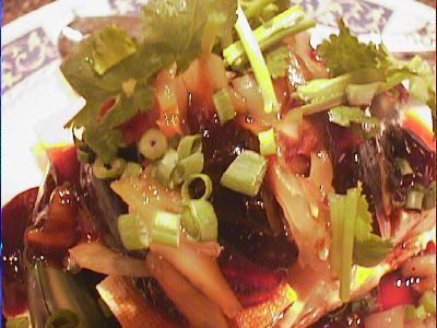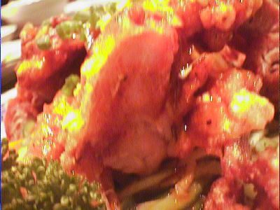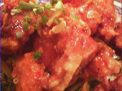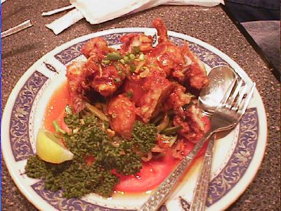 - 最終的に「芝エビと空芯菜炒め」のかわりに出てきたことが判明しました。出てきたときは「鶏肉のバーベキューソース炒め」がこういう形で出てきたのかと思ったけど違った。いわゆる油淋鶏で、中華料理屋で頼むとタレが塩っ辛すぎることが多いんだけど、ここのは丁度よかった。下に細切りにしたキュウリがしいてあるのも吉。(め)