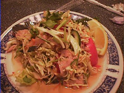 - このサラダ美味しい。魚もからっと揚がってるし、ソースもこういうカンボジア系のやつが、ドレッシングとかで売ってるとうれしいんだけどね。(び)