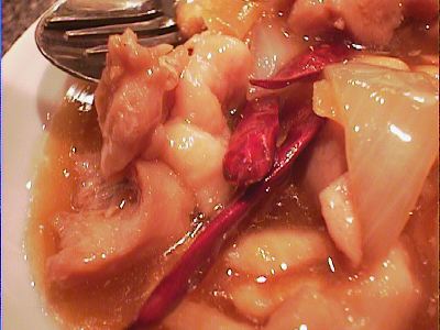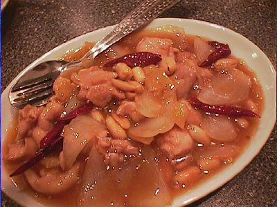 - 食事会リファンレンスメニューの「鶏肉とカシューナッツ炒め」もあったんだけど、隣に「宮保鶏丁」を発見したので、こっちのほうがいいかなと思って注文しました。もっと汁気の少ない、唐辛子バリバリの硬派なものを想像してたのに、思ったよりやわらかくて甘い味だった。美味しいけど。(め)