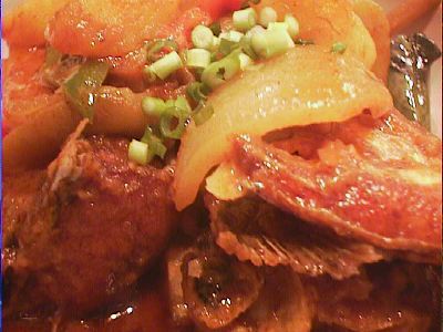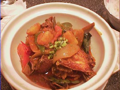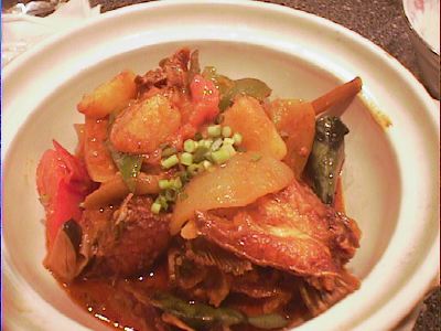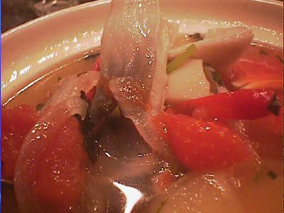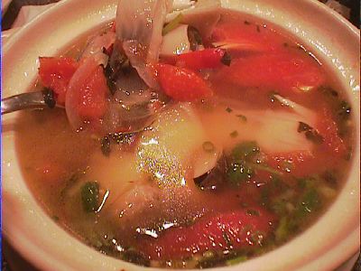 - もうこのへんになるとみんなお腹いっぱいになってきて、料理を楽しめるという状態ではなくなっていたけど、でも美味しかった。もっと、タイ料理のトムヤムクンっぽい、酸っぱ辛いスープを想像したけど、みんなも言うように洋風な感じだったのは意外。具は魚とタマネギとトマトが主体。(め)