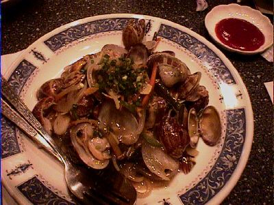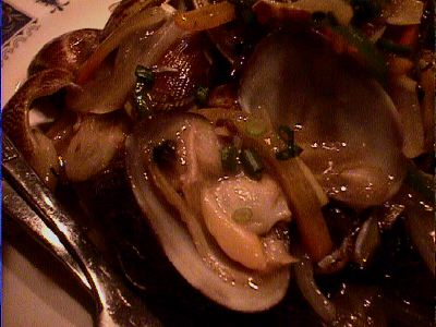 - これはタイ料理屋で好きなメニューのアサリ炒めと比較してみたくて、一皿だけ頼んだのですが、どうやら注文してから材料を買いに行ったらしく、最後の最後になって出てきました。このお店は場所的にもあまり回転のよい店ではなさそうなので、こういう店でアサリの料理などを注文してはいけないという鉄則があるんだけど、味がみたくて頼んでしまいました。中華丼みたいな味付けというか、塩味でちょっととろみがつけてあって、千切りにしたニンジンやピーマン、タマネギが入ってるというもので、確かにタイ風のアサリ炒めとは全然違ったので、好奇心は満たされました。これ、カンボジア料理のところにあったメニューなのに、どこがカンボジア?(笑)(め)