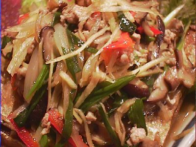魚はいくつか味つけがあったんだけど、タイ産って意味不明だよね。しょうがが効いていて、あと野菜とかしいたけ千切りとかが入ってる。和風、っていってもいいかんじの味付け。もっと骨までサクサクになるまで揚げて欲しかった。魚自体はおいしかったよ。(め)