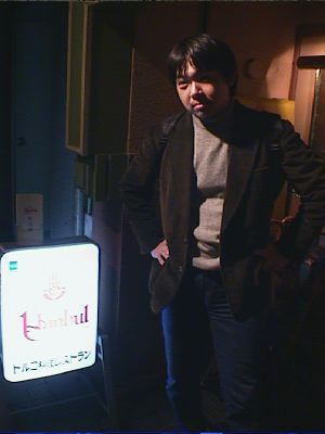 例によってお店の入口、地下に降りる階段の上で看板と並んで記念撮影。