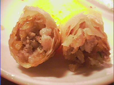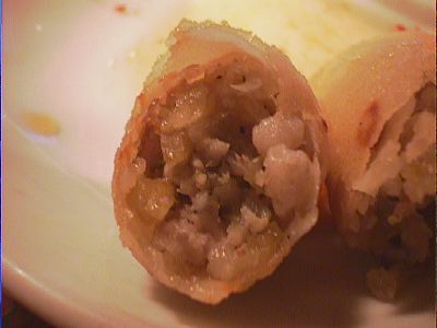- わりにパリっていうよりはサクってかんじで、中はやわらかいひき肉とねぎとピーマンかな?