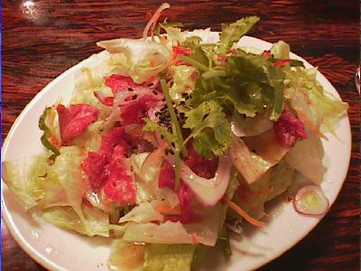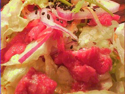 - メニューの写真も真っ赤でサーモンみたいだったんだけど、現物もそうだった。火の通り過ぎてる肉より、こういう肉が好きだな。レタスが新鮮だし、レモンの効いたタレがとてもいい。上にかかったゴマもおいしい。たまねぎのさらしてないピリピリ感も刺激的でたまらない。(め)