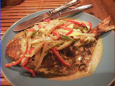- 一応頑張れば骨も食べられるけど、背骨はやめた方がいいかな。縁側や頭はよかった。ソースはココナッツ仕立ての一種のカレーだね。(め)