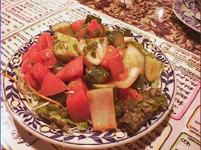 - 結構好き。トマトときゅうりとタマネギ。お酢と油のドレッシングにマサラがたっぷり。野菜のシャキシャキ感とドレッシングのスパイシーさがクセになる。(め)