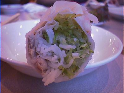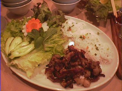 - ベトナム料理屋のこういう具合に包んで食べるのは、うまいものが多いから頼んでみるといいね。これに生春巻きの皮がついてきたりするといいね。(め)