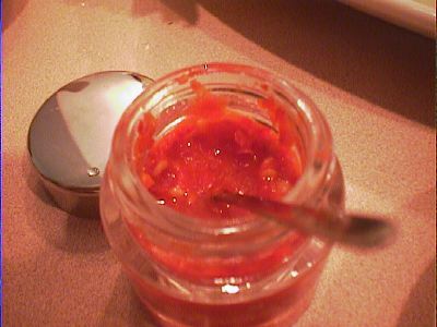 - 辛さが欲しい場合は、テーブルに置いてあるこの唐辛子を使います。唐辛子をすり潰したものなんで、思いっきり辛いので使いすぎには注意。