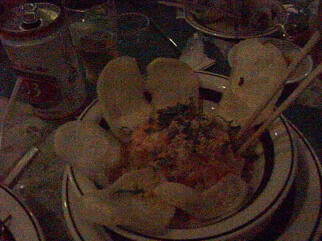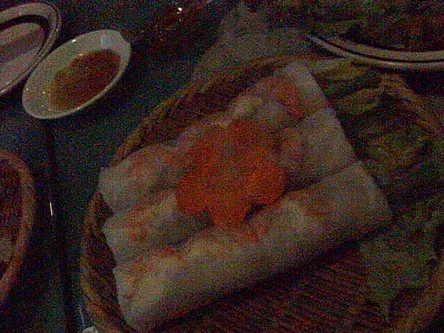 - ここの生春巻はポイント高いよ。海老がしっかり入ってるし、巻き方もふわふわっとしてていいしね。もう少し野菜が入っていてもいいけど、具的には問題ないね。皮はもう少しよく戻した方がいいかな。タレは割とさらっとした感じなんだけど、甘みがちょっと強いかな。(め)