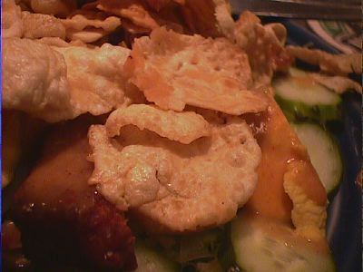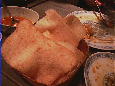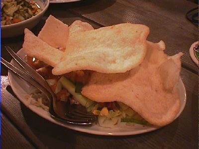- こっちのエビ煎餅の方が、ガドガドにのっていたものよりさくさくしててよかったな。ガドガドにのってたのは、ガドガドのスープがしみて、くたーっとしちゃってた。(び)