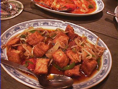 - 揚げ豆腐みたいなのにタレの味が染み込んでてね。揚げた衣の油とタレがマッチしてて絶妙な味をかもしだしていた。