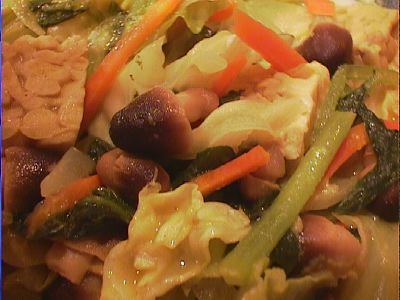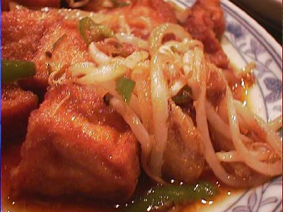 - 揚げ豆腐と野菜の唐辛し味噌サンバルをきかせた炒めもの。(*)