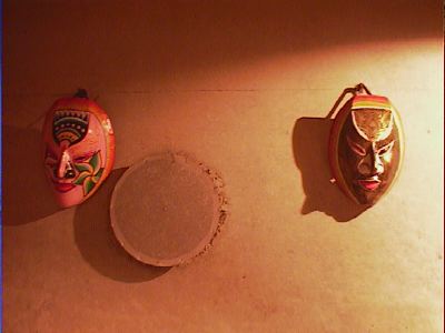 天井からは不思議な人形がつるされていて、壁にはお面が飾ってあります。