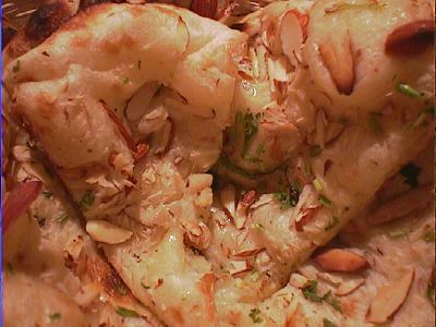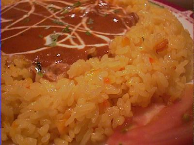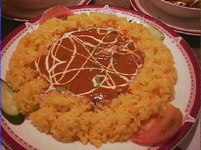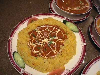 これは、サフランライスの真ん中にプローンマサラを流し込んだものです。メニューにはシュリンプビリヤニって書いてあるんで、騙された!っていう感じです。(び)