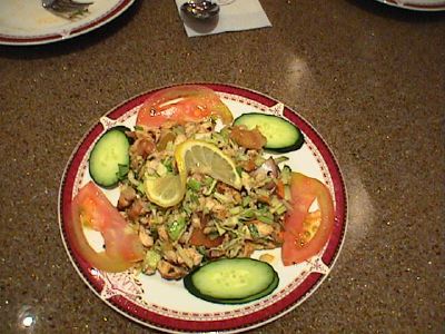 このサフランライスは例の香り(洗剤みたいな香り。ESDではとりあえず「にせサフランの香り」と呼んでいる)がする。普通のライスがなかったのでやむを得ず頼んだから仕方ないね。(め)