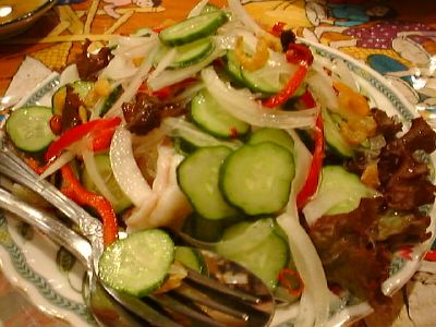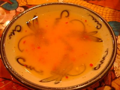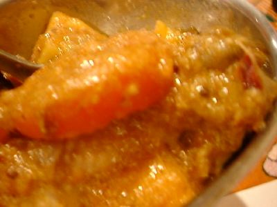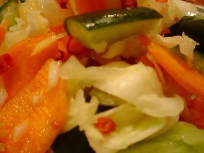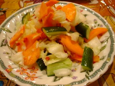 アチャールみたいな酢漬けの野菜を期待したら、単なるキャベツの浅漬けでがっかり。なかに唐辛子の刻んだのが入っているところがわずかにエスニック。これなら田舎のおばあちゃんも食える。まずくはないけど、ほんとに単なる浅漬け。(め)