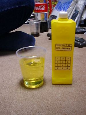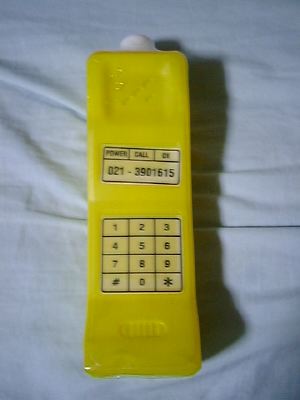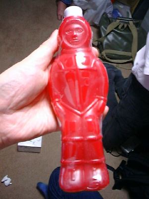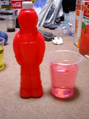 赤い方が宇宙飛行士の形の容器のココナッツジュース、黄色い方は携帯電話の形の容器のライチジュース。
