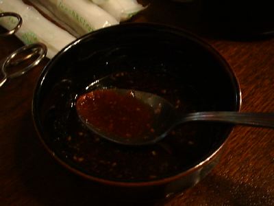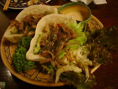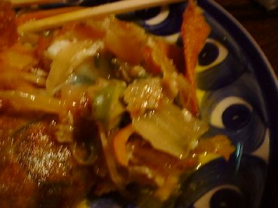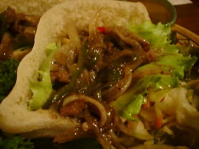 メニューの写真ではもっと乾燥した肉と野菜がはいってるかんじだったんだけど、実際はとろっとした感じ。中身は火がとおったたまねぎとピーマンと肉。ソースはちょっと酸味がある。中華の甘酢あんかけみたい。ミュンとかで食べる牛肉甘い酢あんかけみたいなとろみがあるね。(め)