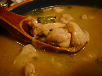 基本的にしっかりとしたチキンのだしのスープに、胡椒を効かして、ピーナツソースを入れてある。具はチキンとししとう、あとたまねぎがいっぱい入ってる。(め)