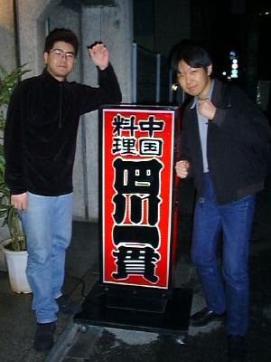 四川一貫の前でいつものふたりが記念撮影。