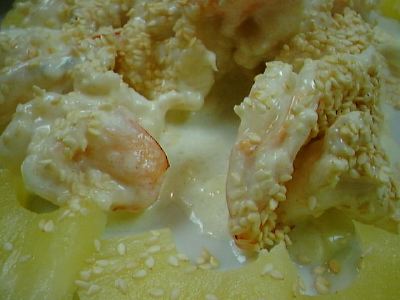 - 旨い。味付けはマヨネーズだけ(他にも調味料を使用しているが、これは秘密とのこと)ということであるが、すばらしい。蝦の味がマヨネーズに負けてなくて、しっかりうまみがでている。これは一人で一皿たべたかったなぁ。(な)