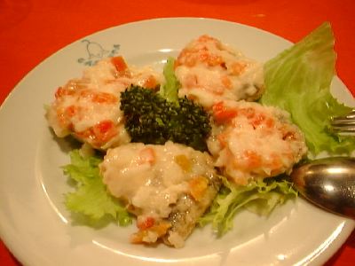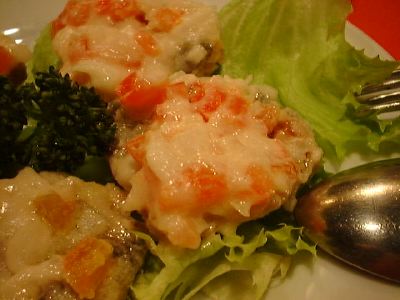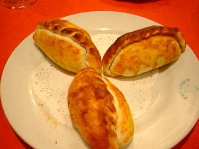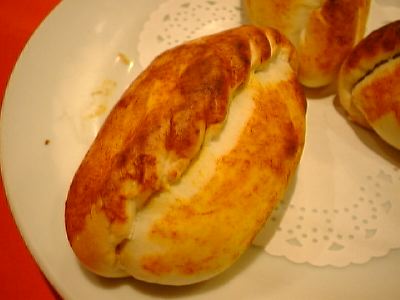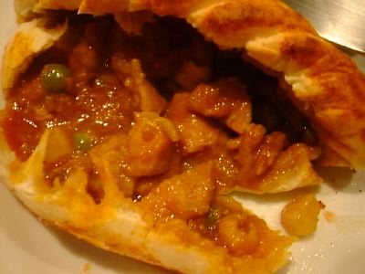 パンのような形してるけど、パイ包み。これはフォークとナイフで切って食べるよりも、手で持ってそのまま食べたほうがよい。中は結構熱いからやけどしないように注意しないとね。わりとスパイシーで、うまみ成分がでていて、味はいいね。(な)