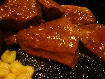 よく串やき等で食べるものというのは、肉汁がしたたりおちてしまい、以外にパサパサしたものが多いが、これはジューシー。スパイスもよくあっているし、ちょっと苦みがあるのがよい。(な)