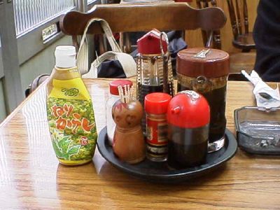 テーブルには大きな「ねりからし」のチューブが置いてあったりする。