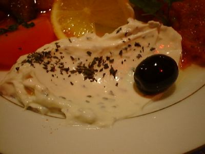 キレのあるヨーグルト。甘みがなくてシャキッとしてるような感じ。香辛料入って辛めのトマトソースに、ポテトサラダ、オリーブの実がうまかったね。(な)