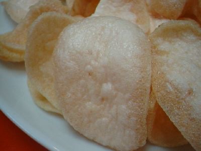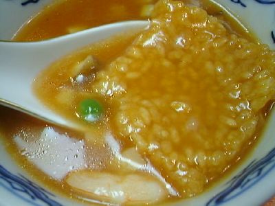 前回のようにソースをかけて食べる時は、サクサク感を楽しみながら食べるのがよいけど、スープの時は細かくつぶしてお粥のような感じにして食べるのが好き。個人的な好みの問題だろうけど、スープの時は、もっととろみの少ないサラサラ系の具は野菜のみとかのスープの方がいいな。(び)