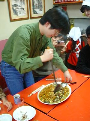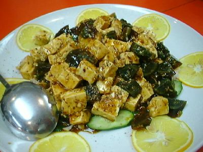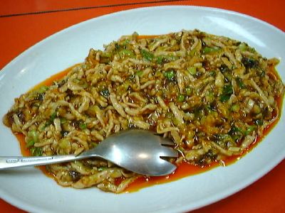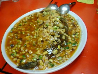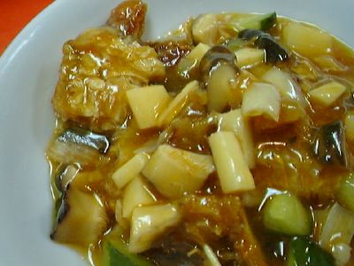 魚の丸揚げにあんをかけた料理というのは、インドシナ系のお店でも頻繁に頼むのだけど、最初に魚を細かくばらして、あんと混ぜてしまうという食べ方、これは皮蛋豆腐に花椒がかかっていたのと同様、目から鱗的な発見でした。今度、どこかのタイ料理屋さんとかで、骨まで全部食べられるようにしっかり揚てある魚のあんかけ料理を食べる時に、この食べ方を試してみよう。(び)