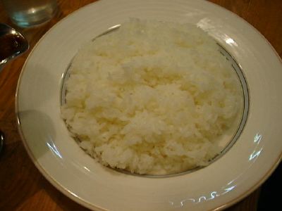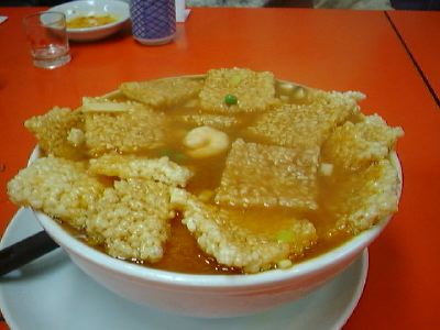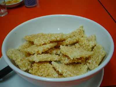 おこげ。スープをかけたときに、ジューという音、漂う香り、見て聴いて楽しめる名品。ちなみに、鍋[米巴]蝦仁となると、おこげあんかけとなる。(な)